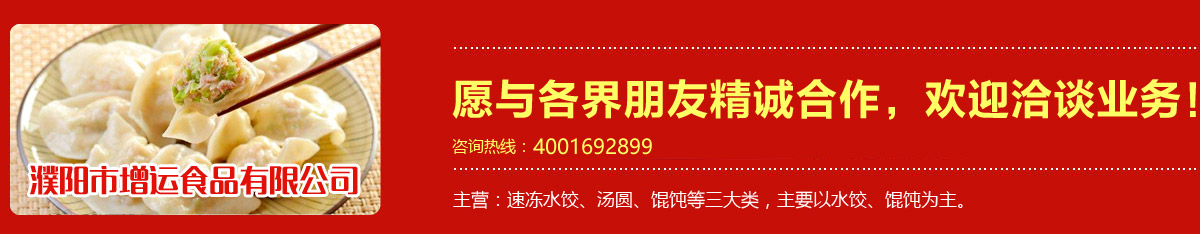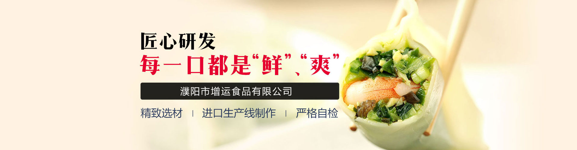 河南·濮陽增運食品有限公司位于龍的故鄉(xiāng)--濮陽,是一家生產速凍米面食品的專業(yè)公司,著力打造“增運”品牌,產品主要有速凍水餃、湯圓、餛飩等三大類,主要以水餃、餛飩為主。公司擁有兩個先進加工車間,一個凍品加工車間,能滿足各種速凍產品的加工需求。